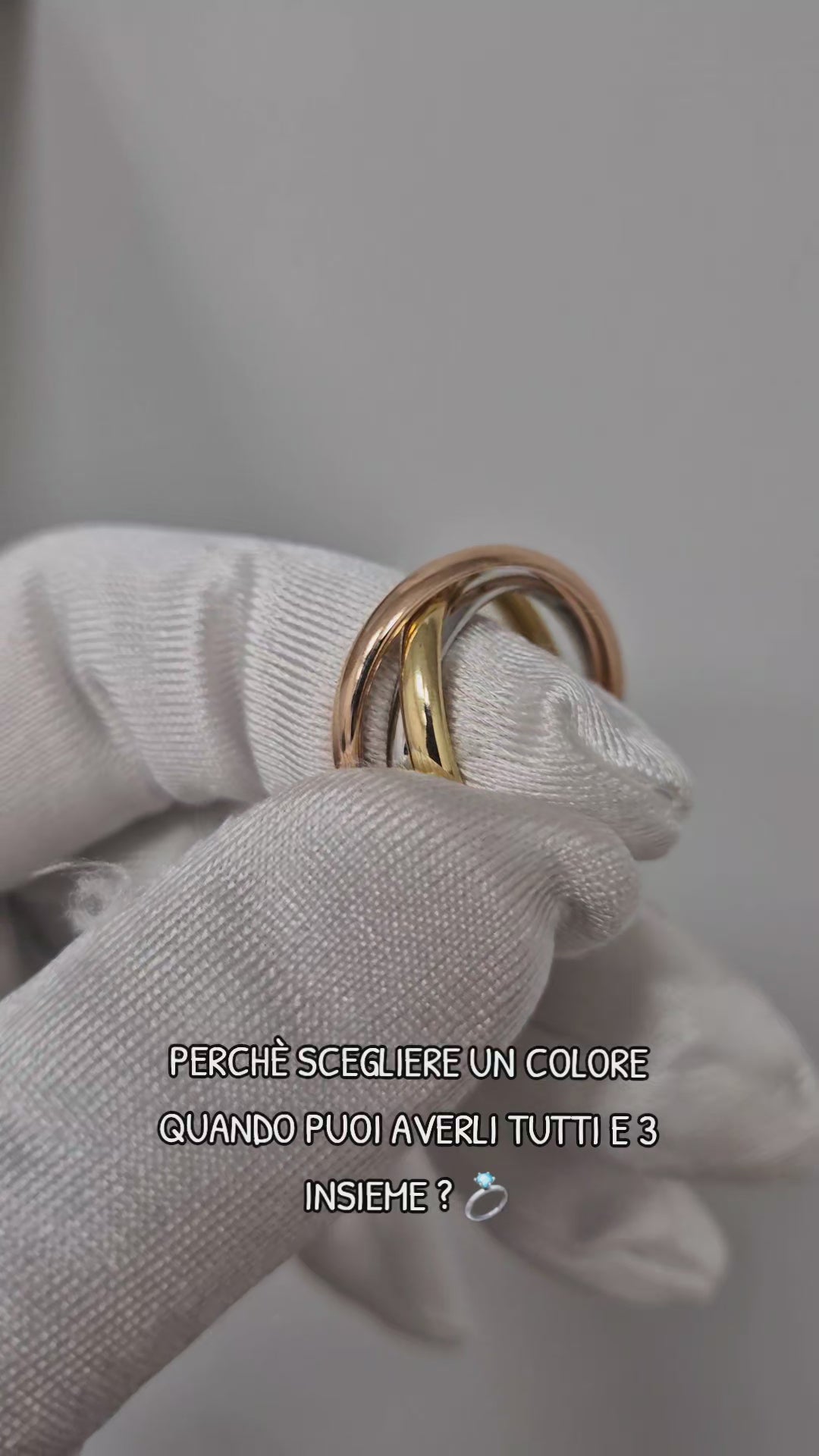 Anello Tris D'Oro: eleganza tricolore in argento 925. Tre fermanelli placcati in oro bianco, giallo e rosa si uniscono in un'unica composizione raffinata, permettendoti di indossare tre stili diversi in uno. Perfetto per chi ama la versatilità e desidera un anello che si adatti a ogni occasione e outfit. Qualità garantita con argento 925 autentico.